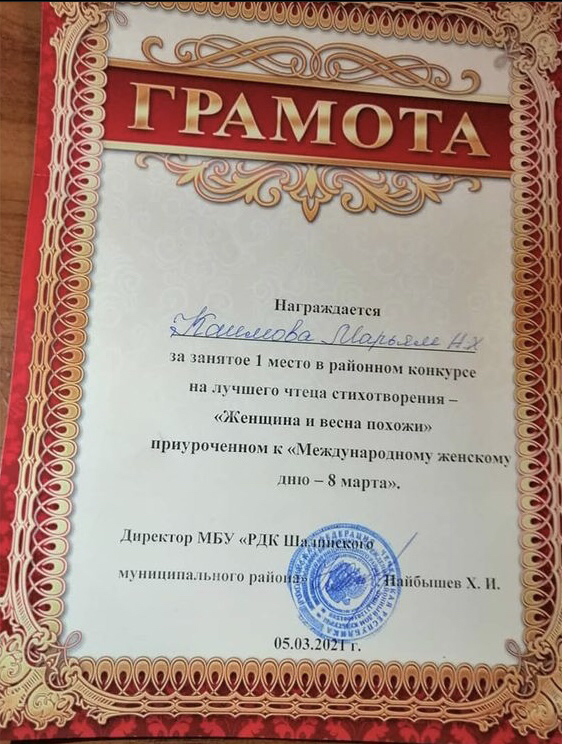 Ещё одной победой ознаменовалась эта неделя. Наша Каимова Марьям заняла 1 место в конкурсе чтецов . Конкурс завершён победой, Быть иначе не могло, За звездой счастливой следуй, Чтоб тебе всегда везло!